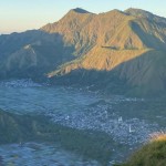 The perspective from 637 m over the towns and fields of Sembalun Lawang and Sembalun Bumbung is of the superb display of the old caldera of Mt. Rinjani.